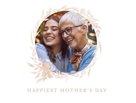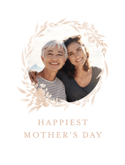 This Mother's Day card features a photo surrounded by a soft... beige wreath of leaves and flowers, with a green outdoor background. You can personalise this card with your own photo. Available as a postcard and greeting card, this card is blank inside so you can personalise it with a message of your own. All our cards are printed with premium paper with a glossy finish.