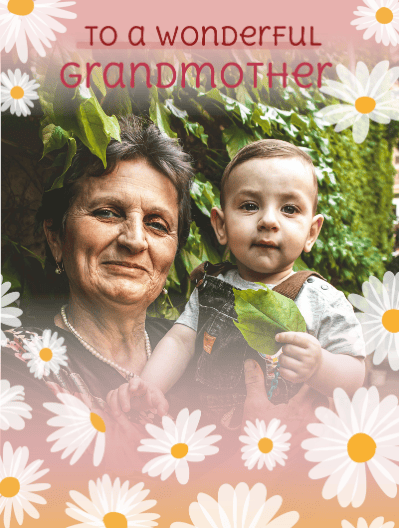 Celebrate your wonderful grandmother with this beautifully d... esigned card, featuring a heartwarming photo, a soft pink and orange gradient, and charming daisy border. Personalise it with your own heartfelt message to make her feel truly special on Mother's Day, her birthday, or just because. Order your unique card online today. Available as a postcard and greeting card, this card is blank inside so you can personalise it with a message of your own. All our cards are printed with premium paper with a glossy finish.