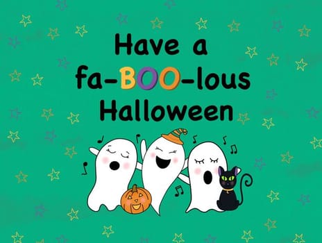 Send a smile this Halloween with our fa-BOO-lous card! Featu... ring cheerful singing ghosts, a cute pumpkin, and a friendly black cat on an emerald green background, it's perfect for all ages. Personalise it with your own message to make their Halloween truly special. Available as a postcard and greeting card, this card is blank inside so you can personalise it with a message of your own. All our cards are printed with premium paper with a glossy finish.