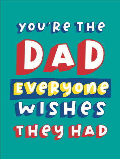 Make your dad feel truly special with this vibrant, text-centric greeting card. Its bold 'YOU'RE THE DAD EVERYONE WISHES THEY HAD' message, set against a striking teal background with playful 3D fonts, delivers immense appreciation. Personalise the inside with your heartfelt message to create a cherished keepsake for Father's Day, his birthday, or just to say thank you. Available as a postcard and greeting card, this card is blank inside so you can personalise it with a message of your own. All our cards are printed with premium paper with a glossy finish.