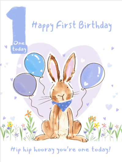 Celebrate a precious first birthday with this delightful car... d, featuring a charming watercolour bunny, balloons, and wildflowers. Personalise the inside with your heartfelt message to make their special day even more memorable. It's the perfect way to send warm wishes across the UK. Available as a postcard and greeting card, this card is blank inside so you can personalise it with a message of your own. All our cards are printed with premium paper with a glossy finish.