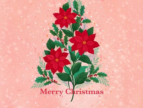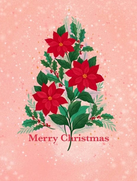 Send festive cheer with our elegant Poinsettia Christmas Tree Card. Three vibrant poinsettias form a beautiful Christmas tree against a sparkling pink background, creating a modern twist on a traditional holiday design.