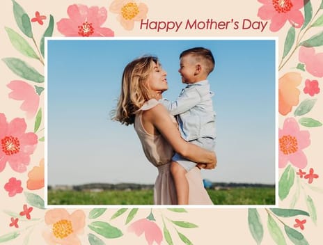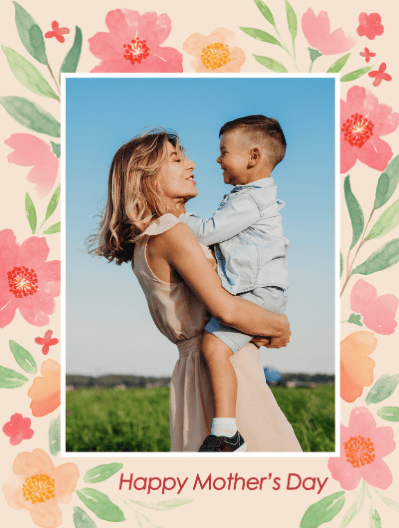 This beautiful card features a soft light beige background w... ith a delicate white photo frame at the centre, surrounded by watercolour-style pink, peach and green florals. Add your favourite photo to create a truly personal touch. Finished with the words “Happy Mother’s Day” in elegant dark red script, it’s a lovely way to send your mum and make her feel extra special. Available as a postcard and greeting card, this card is blank inside so you can personalise it with a message of your own. All our cards are printed with premium paper with a glossy finish.