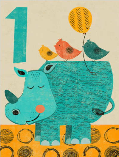 Whimsical First Birthday Card: Rhino & Birds