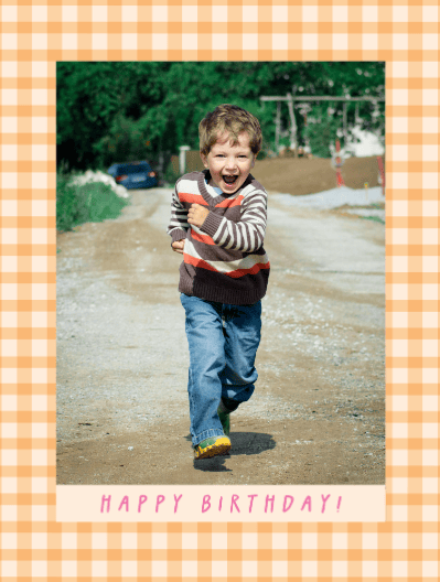 Celebrate their special day with this cheerful personalized birthday card. Add your favorite photo to the prominent center, framed by a delightful light peach and white gingham check border. The playful 'HAPPY BIRTHDAY!' message in a pinkish-orange font makes this a warm and memorable greeting. Available as a postcard and greeting card, this card is blank inside so you can personalize it with a message of your own. All our cards are printed with premium paper with a glossy finish.