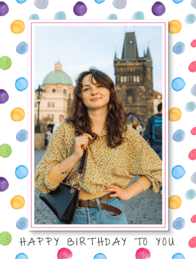 This birthday card features a white background with colorful... watercolor-style polka dots and a rectangular frame for your photo. You can personalize this card with your own photo. Available as a postcard and greeting card, this card is blank inside so you can personalise it with a message of your own. All our cards are printed with premium paper with a glossy finish.