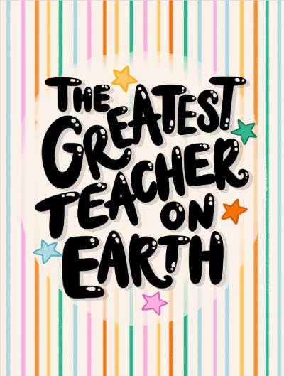 Celebrate an amazing educator with our "Greatest Teacher on Earth" thank you card. Its cheerful design features colorful stripes, bold bubbly text, and celebratory stars. Personalize it with your own heartfelt message to make their day extra special. Available as a postcard and greeting card, this card is blank inside so you can personalize it with a message of your own. All our cards are printed with premium paper with a glossy finish.