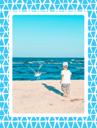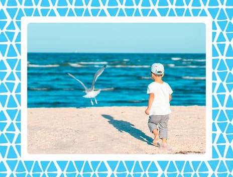 Capture cherished memories with this vibrant personalized greeting card. Upload your favorite photo to feature within a crisp white frame, set against a cheerful sky-blue border with playful white triangles. It's perfect for celebrating a child's birthday, a new baby, or simply sending a warm 'thinking of you' message to loved ones. Available as a postcard and greeting card, this card is blank inside so you can personalize it with a message of your own. All our cards are printed with premium paper with a glossy finish.